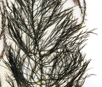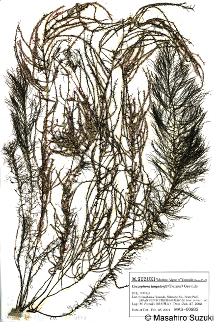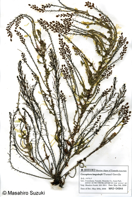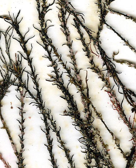 | 山田町のスギモクは,日本海のスギモクと比べると,形態的にはそれほど違いがないものの,大きく異なる点があります。それは,付着藻が非常に多い事です。日本海佐渡島で採集したスギモクにも,クロガシラの仲間,フクリンアミジ,スジウスバノリなどが付着していましたが,山田町のスギモクはその比ではありません。標本を作る際に,出来る限り付着藻を外しているため,上の標本写真では付着藻が少ないように見えますが,実際はスギモク本体が見えない程に着生しています。主なものは,緑藻:アオサ・アオノリの仲間,ウチウミハネモ,褐藻:クロガシラの仲間,アミジグサ,ネバリモ,ウスカワフクロノリ,ハバモドキ,紅藻:マクサ,ユカリ,ナンブワツナギソウ,コスジフシツナギ,オイワケキヌイトグサ,イソムラサキ,イトグサの仲間ですが,ここに挙げた以外にも,未同定のシオグサ属,シアノバクテリア,珪藻類,シオミドロ属,ナミマクラ属,無節サンゴモ類などがびっしりと付着しています。標本を作るためにこれら付着藻を外すだけで一仕事で,スギモク1本で10枚(10種)以上の押し葉標本が作れるほどです。これは三陸沿岸が親潮流域であるため,海藻が生育するためのミネラルが豊富なためと考えていますが,一度きちんと比較してみたいと思っています。山田町の海はとても豊かです。 | ||||