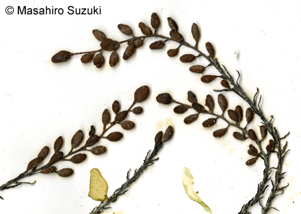 | スギモクの押し葉標本(採集地:岩手県 下閉伊郡 山田町 浦の浜 採集日:2006年5月5日) | スギモクの生殖器床 | |||