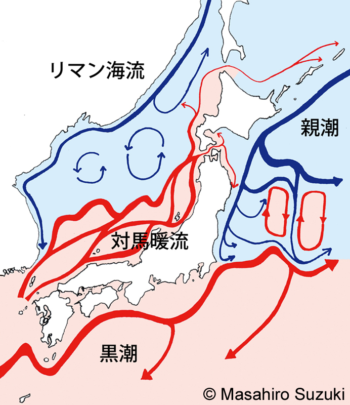 | スギモクは日本海特産種の代名詞です。日本海の海藻であるスギモクがなぜ太平洋側の山田町に生育しているのでしょうか。これは,日本周辺を流れる4つの海流の内の一つである対馬暖流と大きく関わっていると考えられます。下図は日本周辺を流れる海流を示したものですが,対馬暖流は日本海を北上した後,津軽海峡を越え,津軽暖流と名前を変えて太平洋沿岸に注いでいます。山田町にスギモクが生育している理由,それは対馬暖流が山田町までその影響を及ぼしている証拠と考えられています。 | ||||