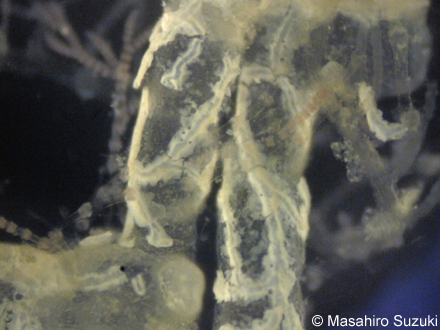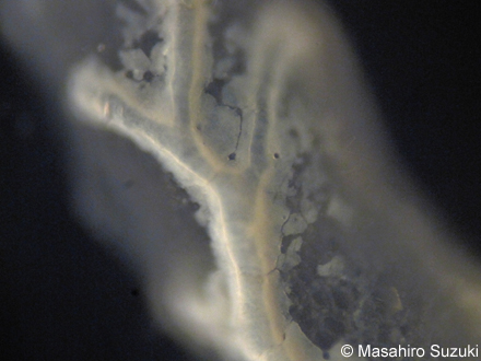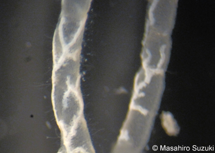 | 石灰の沈着をもっときれいな写真で表現したいと思い,師の顕微鏡を借りて暗視野照明で観察を行いました。上の2枚の写真が暗視野で撮影したものですが,顕微鏡をのぞいた途端,椅子から滑り落ちそうになりました。写真を見ると,石灰の中に空洞があるのが分かると思います。まるで「管」のように。そう、これは動物の棲管だったのです。おそらくはウズマキゴカイやカンザシゴカイのような多毛類の仲間だと思いますが,ワツナギソウの枝の上で動物が石灰を分泌したもので,石灰化でも何でもなく単なる着生動物だったのです。考えてみれば自然の状態で石灰が網状に沈着するなどあり得ない事でした。なぜ最初から動物を疑わなかったのか…,がっくり来てしまいました。