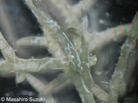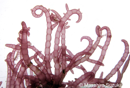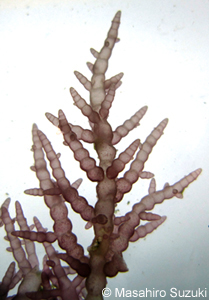 | 実体顕微鏡をのぞくと,ワツナギソウの枝に白いものが線状あるいは網状に付着していました。それが石灰だと気が付くのに時間はかかりませんでした。海藻には体に石灰を沈着させるものが知られています。代表的なものは,サボテングサ(緑藻),ウスユキウチワ(褐藻),コナハダ(紅藻),サンゴモ類(紅藻)などでしょう。著者の心は躍りました。「石灰化する」という特徴は,このワツナギソウをChampia parvulaと区別して新種記載するのに申し分の無い特徴です。ついにChampia ryukyuensisを新種記載する時が来たのです。その上,ワツナギソウを含むマサゴシバリ目(Rhodymeniales)では,これまで石灰化した仲間が知られておらず,立派な新知見です。さらにさらに,枝の上に網状に石灰を沈着させる海藻などこれまで聞いた事もありません。藻類の石灰化の新しい型である事に間違いなく,そのメカニズムは生物学的にも大きな発見かもしれません。「これは石灰化を研究している専門家に連絡を取った方が良いな」などと,著者の妄想は膨らみました。 | ||||