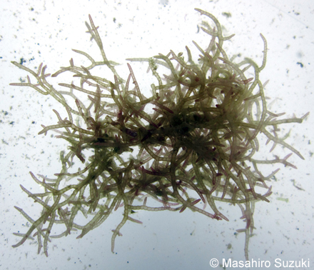 ならば片っ端から新種として記載してしまいたいところなのですが,分類学の基本として,新種記載はタイプ法に従って行います。これまでChampia parvulaと同定されてきたものを新種とするためには,Champia parvulaのタイプ標本と原記載あるいはタイプ産地(スペイン カディス地方)で採集したChampia parvulaと比較しなければなりません。形態及び分子系統解析によってはっきりとした違いを示すことが出来てようやく新種として記載する事が出来るのです。ところが,肝心のタイプ標本と原記載から得られる情報は,「体が円柱形で不規則に分枝する事」だけです。この特徴は,全ての隠蔽種に当てはまるため比較になりません。しかもChampia parvulaは生育場所によって外形が激しく変化する事が知られており,外形だけで種を分けるのは非常に難しいと考えられます。そのような中で,Lozada-Troche & Ballantine (2010)は,プエルトリコでChampia parvulaと同定されてきた種類と,Champia parvulaのタイプ標本とを比べたところ,小枝を生じる位置が異なるという特徴を見つけ,Champia puertoricensis という新種を記載しました。著者も早速,この特徴が日本のワツナギソウにも当てはまるかどうか検討してみましたが,日本のワツナギソウは小枝を生じる位置がバラバラで種の特徴としては全く使えませんでした。よって残された手段は,スペイン カディス地方に行き,そこで採集したChampia parvulaを詳細に観察するとともに遺伝子を抽出して分子系統解析を行うことだけです。残念ながら現在,スペインに知り合いがおらず,著者自身も体が空かないことから日本のワツナギソウの分類は完全に行き詰ってしまいました。 ワツナギソウ(Champia "parvula" species complex)の分類は先送りするしかないなと思っていたある日のことでした。沖縄で採集したワツナギソウのホルマリン標本を何気なく見ると,藻体が白っぽく見えました。このワツナギソウのrbcL遺伝子の配列は本州や世界各地のChampia parvulaとは異なっており,少なくとも本州のワツナギソウとは形態が異なる事から,著者は新種であると考えています。仮にChampia ryukyuensisという学名を用意してはいるのですが,前述の通り,スペイン カディス地方のChampia parvulaとの決定的な違いが見つからないため分類学的な結論を保留していました。藻体をビンの中から引っ張り出し,実体顕微鏡で見たところ,思わず「これは!」っと声を上げてしまいました。 |