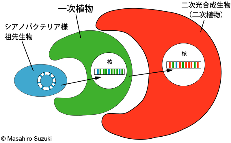 | EGTの模式図:シアノバクテリア様の祖先生物の持っていた遺伝子(青)が細胞内共生(一次細胞内共生)によって,一次植物の核に移動します。一次植物の遺伝子(緑)と一次植物の核にコードされていたシアノバクテリア様祖先生物の遺伝子(青)が細胞内共生(二次細胞内共生)によって二次光合成生物(二次植物)の核に移動します。赤は二次光合成生物の核にコードされた遺伝子。EGTによって一次植物と二次光合成生物の核をコードする遺伝子はモザイク状になっている点がポイントです。*共生体の遺伝子が全て宿主の核に保存されるわけではありません。 | ||||