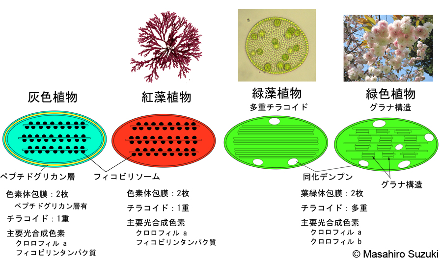 | 共に一次植物の緑色植物(緑藻類)を取り込んで成立した色素体(*)で,主要光合成色素としてクロロフィルaとbを持っています。*:緑色植物に由来するので「葉緑体」と呼んでも差し支えはないと思いますが,一次植物と明確に区別したいことから,本稿では「色素体」としました。 | ||||