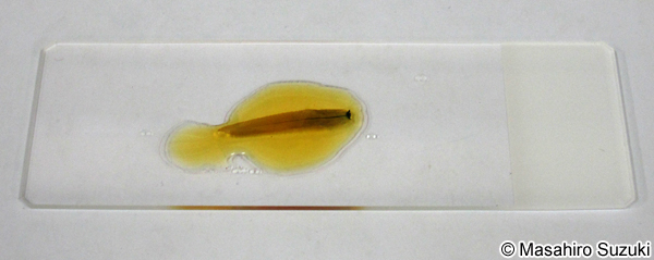 | 4. ティッシュペーパー(キムワイプ)で十分に水を取った後,50%以下に薄めたヨウ素液を1滴たらします。 | ||