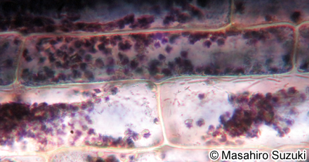 | 葉緑体の色:赤紫~青紫色 *この写真はヨウ素液でやや染め過ぎています。 | ||
