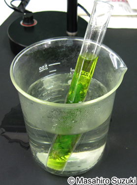 | 1. 十分に光合成をさせたオオカナダモを熱湯に30秒ほど漬けます。 | ||
