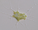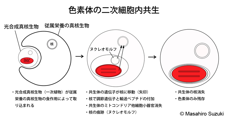| SARには色素体あるいは葉緑体を持つ光合成生物が多数含まれています。唯一の例外(ポーリネラ)を除き,二次細胞内共生,三次細胞内共生,四次細胞内共生によって色素体を獲得したと考えられています。色素体として成立する途中段階と考えられるもの(盗色素体),色素体の入れ替えを行ったと考えられるもの,色素体ではなく他の藻類を共生させているものなど,様々な方法で光合成を行う生物がみられます。 |