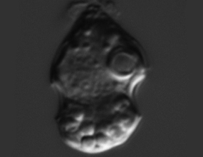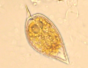 | 単細胞で細胞を一周する横溝とそれに直交する縦溝を持ちます。横溝と縦溝に沿って鞭毛を持ち,横鞭毛はリボン状に巻いています。細胞を鎧版で覆うもの(有殻渦鞭毛類)と鎧板を持たないもの(無殻渦鞭毛類)があります。生活様式は多様で光合成をするもの,他の生物を捕食するもの,サンゴなどの動物と共生するもの(シンビオディニウム Symbiodinium の仲間)など様々です。紅藻の色素体を二次細胞内共生したと考えられ,色素体は3枚の包膜で包まれます。光合成色素としてクロロフィルa, c, ペリディニンなどを持ちます。色素体を失ったものも多く,光合成をしないものは活発な捕食者で,様々な方法で他の単細胞生物を捕食します。キタカンムリムシ (Dinophysis norvegica) やNusuttodinium aeruginosumのように,他の生物から色素体を奪って自身の色素体とするもの(盗色素体現象),シアノバクテリアを共生させるものなども知られています。 | ||||||