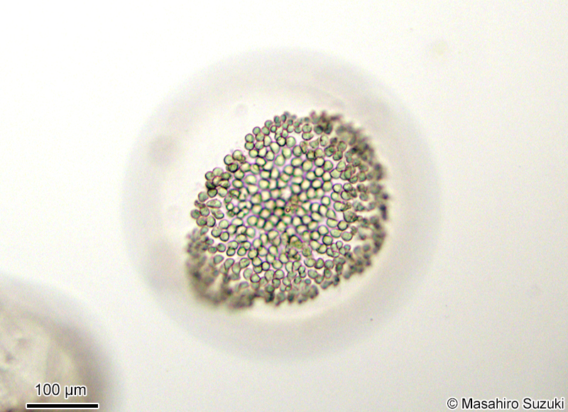 | ヤコウチュウの配偶子母細胞です。多数の配偶子を形成しています。配偶子に鞭毛が確認出来ないことから,未だ成熟途中の状態と考えられます。高倍率で観察したかったのですが,単離した配偶子母細胞をプレパラートにしようとカバーガラスをかけたら途端につぶれてしまい,失敗しました。再トライするか悩んだのですが,採集したヤコウチュウの内,配偶子母細胞は数十個体の中に1個あるかないかという程度しかなかったため,あきらめました。 |