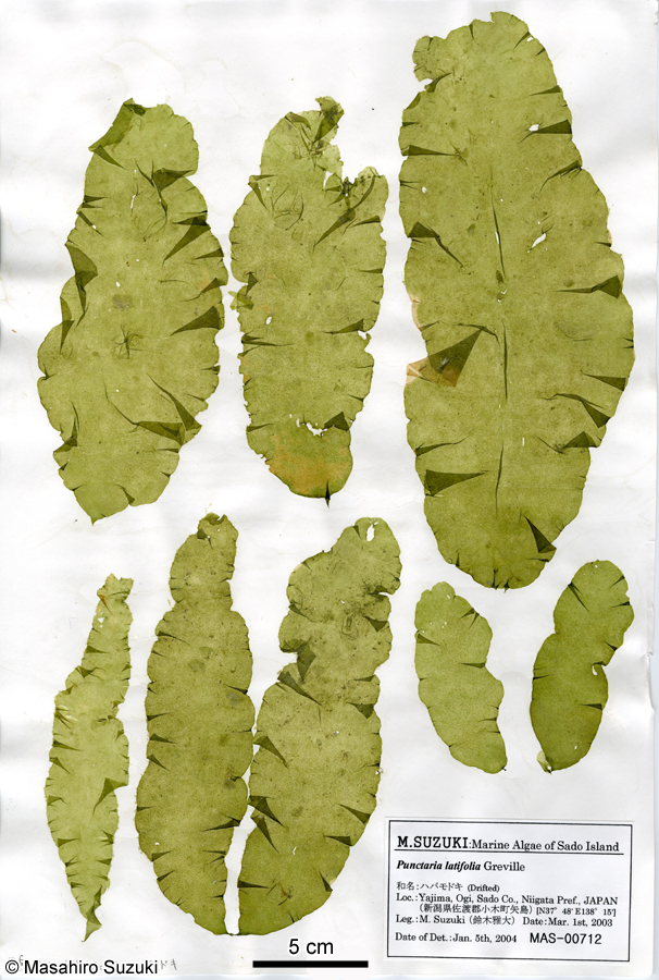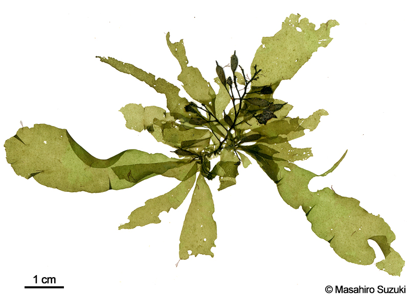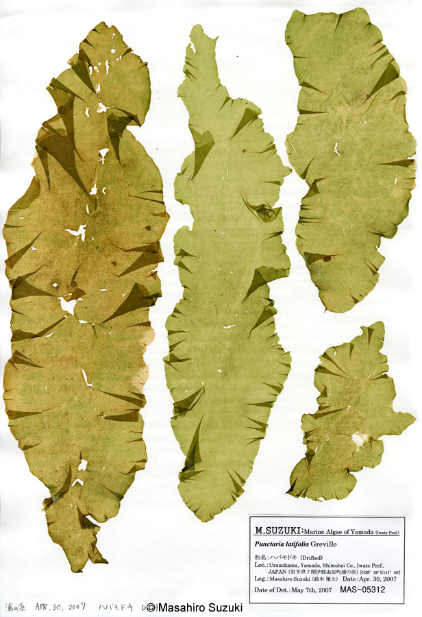 | 大型になるハバモドキ属(Punctaria)で,A3の台紙に収まらないサイズのものが採れることもあります。オオバハバモドキ(P. kinoshitae)ではないかと思ったのですが,同定には遺伝子解析が必要なので,種同定は保留しました。 |