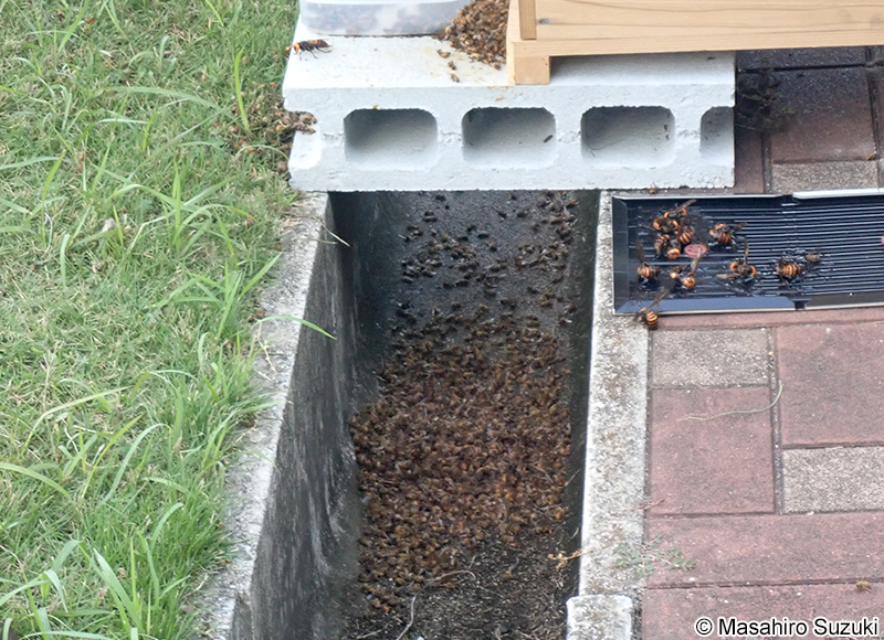 | オオスズメバチに襲撃されたセイヨウミツバチ(Apis mellifera)の巣箱です。朝8時半頃,斥候と思われるオオスズメバチが巣箱の周辺を飛び回っていました。9時過ぎ位に見てみると,数匹のオオスズメバチによる襲撃が始まっておりました。襲撃は数時間程度で終了し,巣箱の下の側溝にはセイヨウミツバチの死骸が積もっておりました。 | ||||