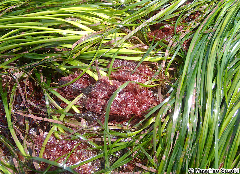 | 海産種子植物のスガモ(Phyllospadix iwatensis)の基部に絡みつくようにして生育しています。 |