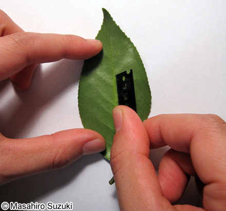| 葉の裏を返し,太い葉脈を避けて半分に切ります。 | ||