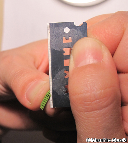 | カミソリ刃を斜めに当て,手前に引きながら薄い切片を作ります。カミソリは引いた時に切れます。この「引いて切る」ことが切片作成で最も注意しなければならない点です。刃を下から上まで広く使う位の感じで切るとコツがつかめると思います。引かずに押して切ってしまうと,切片が潰れてしまい,きれいな横断面を観察する事が出来ません。 | ||
