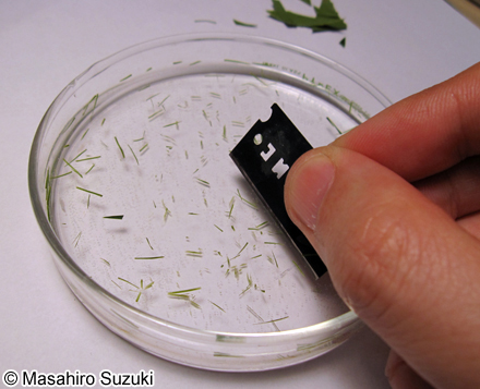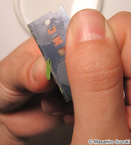 | 作った切片は,カミソリ刃ごと水を入れたシャーレの中に入れます。たくさんの切片の中から,もっとも薄い切片を選び出し,面相筆で拾い上げます。 | ||