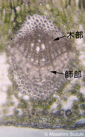 | 柵状組織と海綿状組織を観察するのが本来の目的ですが,葉脈部分を上手に横断すると観察する事が出来ます。茎では表皮側に師部,内側に木部が配列していますが,葉の維管束は葉の上面側に木部,下面側に師部が配列しています。 | |