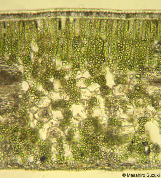| 植物の葉は光合成によるエネルギーの生産工場です。葉は表面から順に上面表皮 upper epidermis,葉肉 mesophyll,下面表皮 under epidermisの3つの領域に分けられます。さらに,葉脈部分には維管束組織が見られます。上面表皮の表面側の細胞壁にはクチクラ層 cuticular layerが発達しています。クチクラ層は細胞壁にクチン cutinが厚く沈着し,そこに蝋(ロウ)が浸透したものです。強い光や紫外線に対する防御や気孔以外の部分から水が失われるのを防いでいます。表皮には気孔 stomataが見られます。ツバキのような照葉樹の葉では葉の下面のみに気孔が見られますが,多くの植物は葉の両面に気孔を持っています。上面表皮と下面表皮に挟まれた部分を葉肉といいます。葉肉を構成する組織は柔組織 parenchymaです。多くの双子葉植物の葉肉は機能,構造から柵状組織 palisade mesophyll (palisade parenchyma)と海綿状組織 spongy mesophyll (spongy parenchyma)の2つの異なる領域に分けられます。柵状組織は光合成によるエネルギー生産,海綿状組織ではガス交換の場として,2つの組織は機能的に分化しています。柵状組織では,細長い細胞が隙間なく並び,各細胞には葉緑体がびっしりと詰まっています。柵状組織には葉の葉緑体の82%が含まれています。海綿状組織の細胞は不規則に並んでいて空気間隙 air space(細胞間隙 intercellular space)が見られます。この空間を二酸化炭素と酸素が循環しています。 | ||