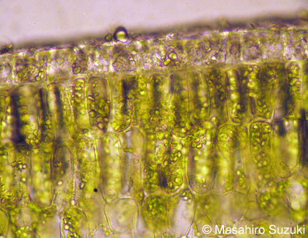 | 気孔を作る1対の細胞です。表面から見ると半月形をしています。表皮の細胞の中で唯一葉緑体を含む細胞です。横断面でも葉緑体を確認出来ますが,切片を作る際に壊れた細胞から葉緑体が飛び散ったり,光の干渉で表皮細胞が緑色っぽく見えたりするため分かりづらいと思います。横断面の観察の前に表面観を観察し,細胞の形や葉緑体を確認すると良いでしょう。 | |