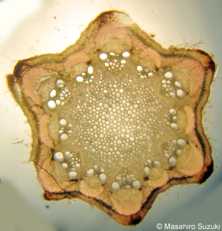 真正中心柱や維管束だけを観察したい場合は,3種のどれを用いても観察に支障はないようです。厚角組織と厚壁組織について比較すると,やはりセンニンソウが最も優秀な教材と考えられます。3種の内,最も観察しづらかったのはハンショウヅルでした。ボタンヅルは採集が難しいかもしれませんが,概ねセンニンソウと同様な切片を観察出来ます。野外でセンニンソウあるいはボタンヅルが採集出来なかった場合は,園芸店で売られているクレマチスで代用することも可能かもしれません。クレマチスの園芸品種は様々なので,よりセンニンソウに近い品種を見つけて教材化すれば,センニンソウの入手が難しい地域の先生方でも植物組織の観察が容易になるでしょう。今後の課題です。