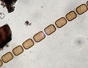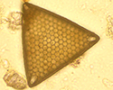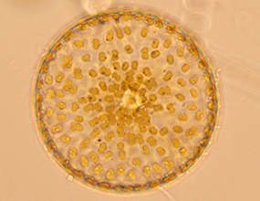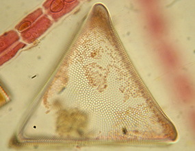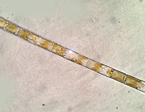 | 単細胞または群体性の生物です。細胞は2枚の珪酸質(ガラス)の殻で包まれ,側面は帯片によって囲まれています。殻には条線と呼ばれる模様があります。クリプト藻の色素体を三次細胞内共生したと考えられ,色素体は4枚の包膜に包まれています。光合成色素としてクロロフィルa, c, フコキサンチンなどを含み,黄褐色をしています。淡水域,海水域に広く分布し,種類は10万種を超えるとも言われ,現在地球上で最も繁栄している生物群の一つです。光合成をするプランクトンの中では最も普通に見られます。形から中心類と羽状類の2つに大別されてきましたが,中心類は系統的に複数のグループから成ることが示され,現在の分類体系では見直しが成され,複数の亜綱(珪藻植物門を認める場合は綱)に分けられています。中心類の精子を除いて鞭毛を持たず動きませんが,羽状類の一部は粘液を分泌することで滑走運動します。