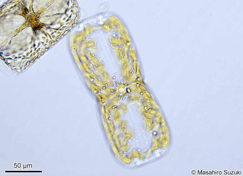 | 珪藻類は,帯面側から見た形と殻面側から見た形が違います。上の写真には帯面側から見た細胞(上)と,殻面側から見た細胞(下)が写っています。気が付かないと全く別の種類のように見えます。著者は専門家に教えて頂くまで分かりませんでした。珪藻類の観察では,帯面側と殻面側のどちらを見ているかを判断する必要があります。 |