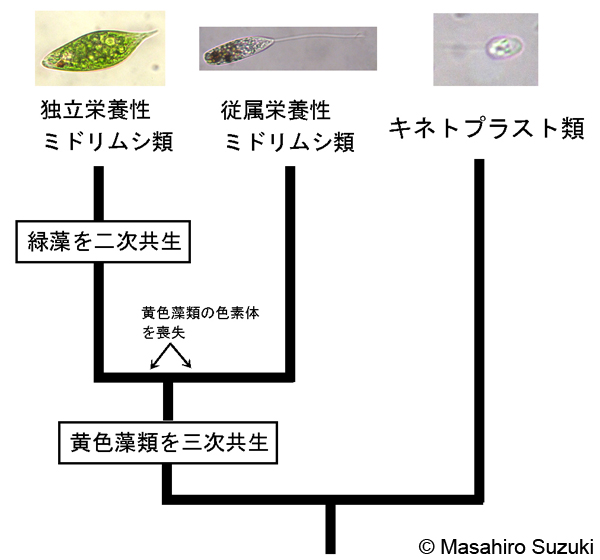 | ミドリムシ(ユーグレナ)門の系統と色素体獲得の模式図 | ||||||
