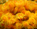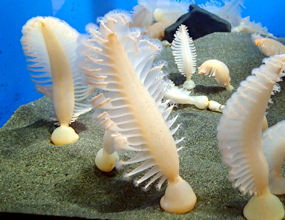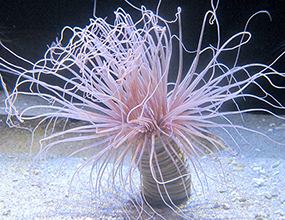 | 花虫綱は,他の綱と違い,世代交代を行わずクラゲの世代を持ちません。ポリプのまま一生を終えます。花虫口道というポリプの中央部まで達する腔所を持つこと,刺胞に刺針を持たないことも花虫綱の特徴です。イソギンチャクの仲間(イソギンチャク目,スナギンチャク目,ハナギンチャク目)はサンゴの仲間(イシサンゴ目,クロサンゴ目)と共に六放珊瑚亜綱に含まれます。八放珊瑚亜綱とは,軸が六軸(ポリプの触手が8本ではない)ことで区別されます。