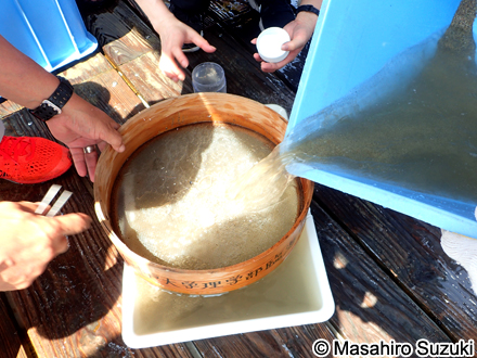 | 海水で洗いながら中の砂を出します | 海水で混ぜながら砂を「ふるい」でこします | |||